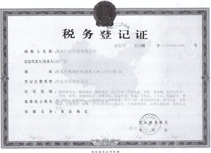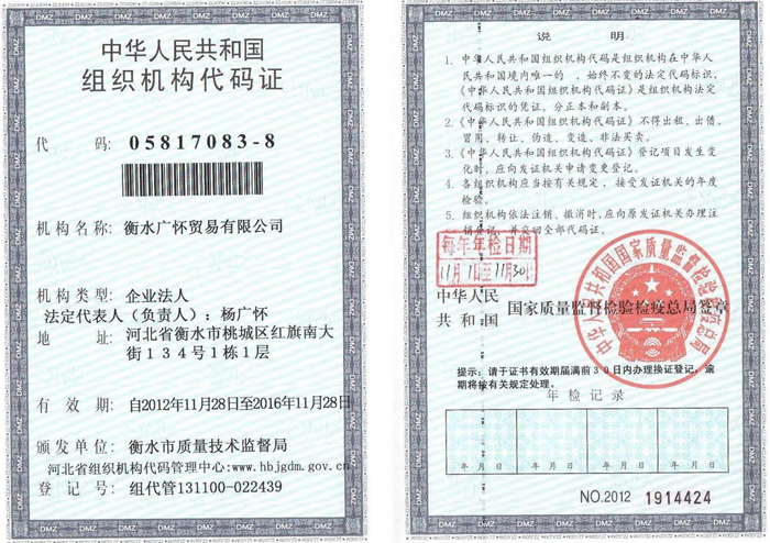 衡水广怀贸易有限公司企业法人营业执照(正本) 衡水广怀贸易有限公司企业法人营业执照(副本) 衡水广怀贸易有限公司税务登记证地税(正本) 衡水广怀贸易有限公司税务登记证地税(副本) 衡水广怀贸易有限公司税务登记证国税(正本) 衡水广怀贸易有限公司税务登记证国税(副本) 衡水广怀贸易有限公司组织机构代码证(正本) 衡水广怀贸易有限公司组织机构代码证(副本)