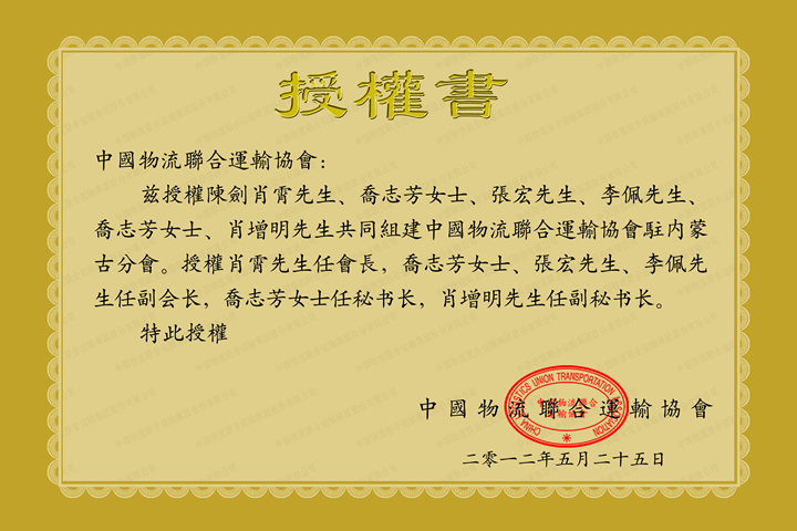 中国物流联合运输协会内蒙古分会授权书