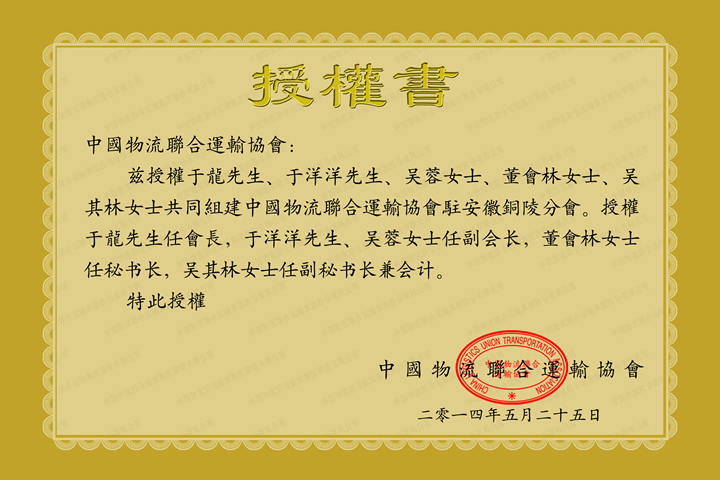 中国物流联合运输协会铜陵分会授权书