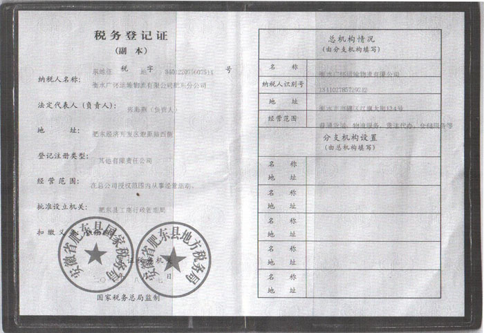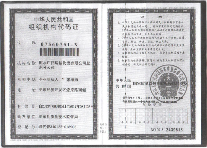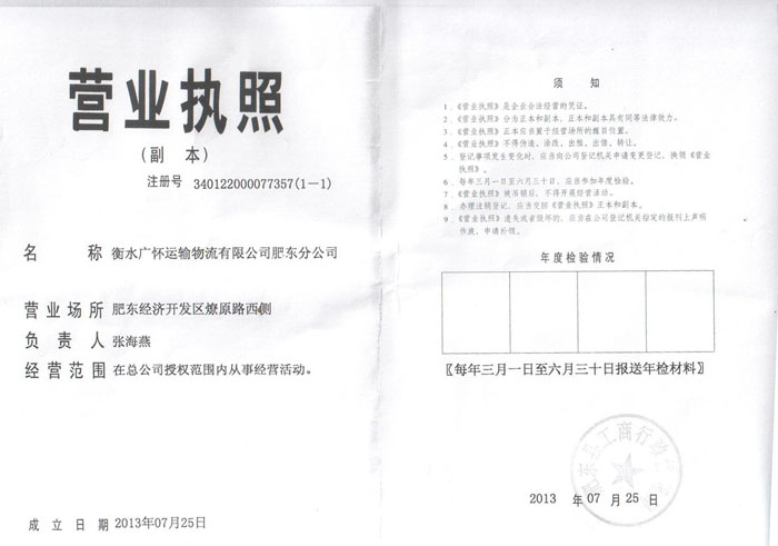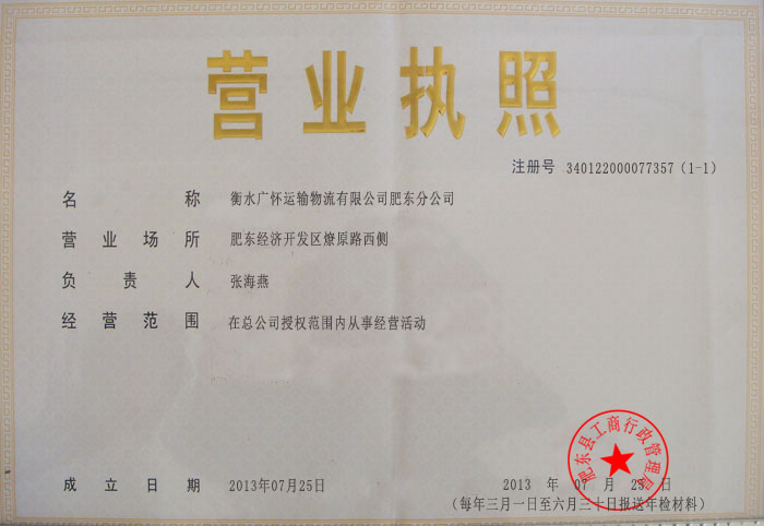 衡水广怀运输物流有限公司肥东分公司营业执照(正本) 衡水广怀运输物流有限公司肥东分公司营业执照(副本) 衡水广怀运输物流有限公司肥东分公司税务登记证 衡水广怀运输物流有限公司肥东分公司组织机构代码证
